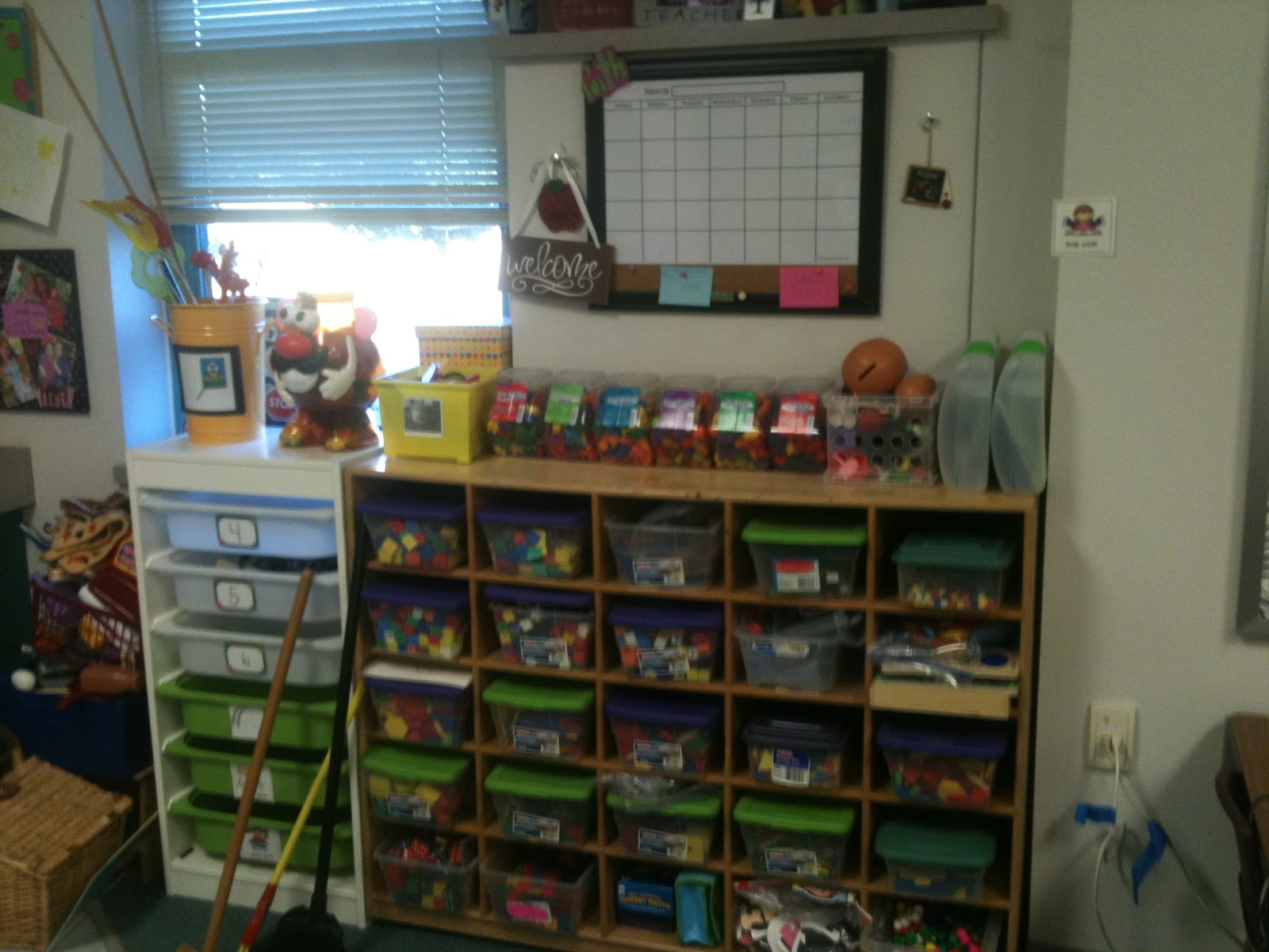 Here are my math munipulatives. They are kinda organzied. Please excuse the brooms and pile of junk in the corner. I haven’t set up my home living center yet so it is in a pile.