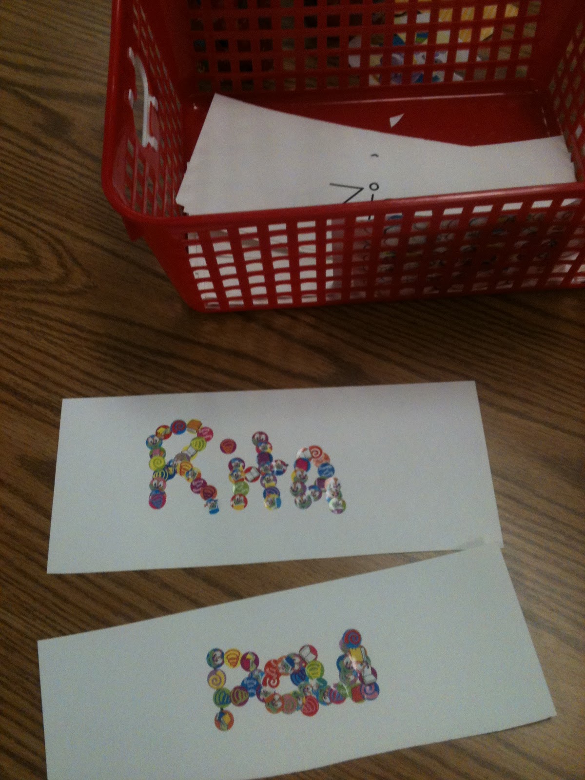 Each week I have FIne Motor center. In this center, students found their name and a sheet of small round stickers in the basket. I printed the names on white cardstock. They take the stickers off and put them on the letters of the name. They do really well at this. (They say Rita and Paul, by the way.) I tell them as a group that they can’t up them on themselves or one another and no one has as of yet. J